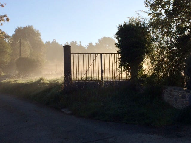 “You walk west all day, past granite farmhouses, and rock walls so old they support thick coatings of lichen, vines, and pink flowers that struggled to find the sun through the layers of stones. In October even near noon time, the shadows are always lengthening. Since we started each morning at dawn, we were blessed with the sunrise of each new day, that drenched landscapes in gold. Curtains of morning fog secreted cornfields, veiled graveyards, shrouded hillsides in inexplicable earth bound mists, shot through with sunlight. Before us at every turn were meadows where the grasses were diamonded with dew.”
