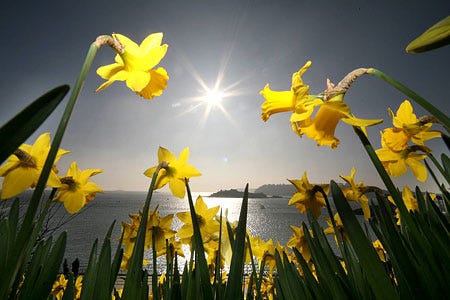 I wandered lonely as a cloud That floats on high o'er vales and hills, When all at once I saw a crowd, A host, of golden daffodils; Beside the lake, beneath the trees, Fluttering and dancing in the breeze.Continuous as the stars that shine And twinkle on the milky way, They stretched in never-ending line Along the margin of a bay: Ten thousand saw I at a glance, Tossing their heads in sprightly dance.The waves beside them danced; but they Out-did the sparkling waves in glee: A poet could not but be gay, In such a jocund company: I gazed- and gazed- but little thought What wealth the show to me had brought:For oft, when on my couch I lie In vacant or in pensive mood, They flash upon that inward eye Which is the bliss of solitude; And then my heart with pleasure fills, And dances with the daffodils.
