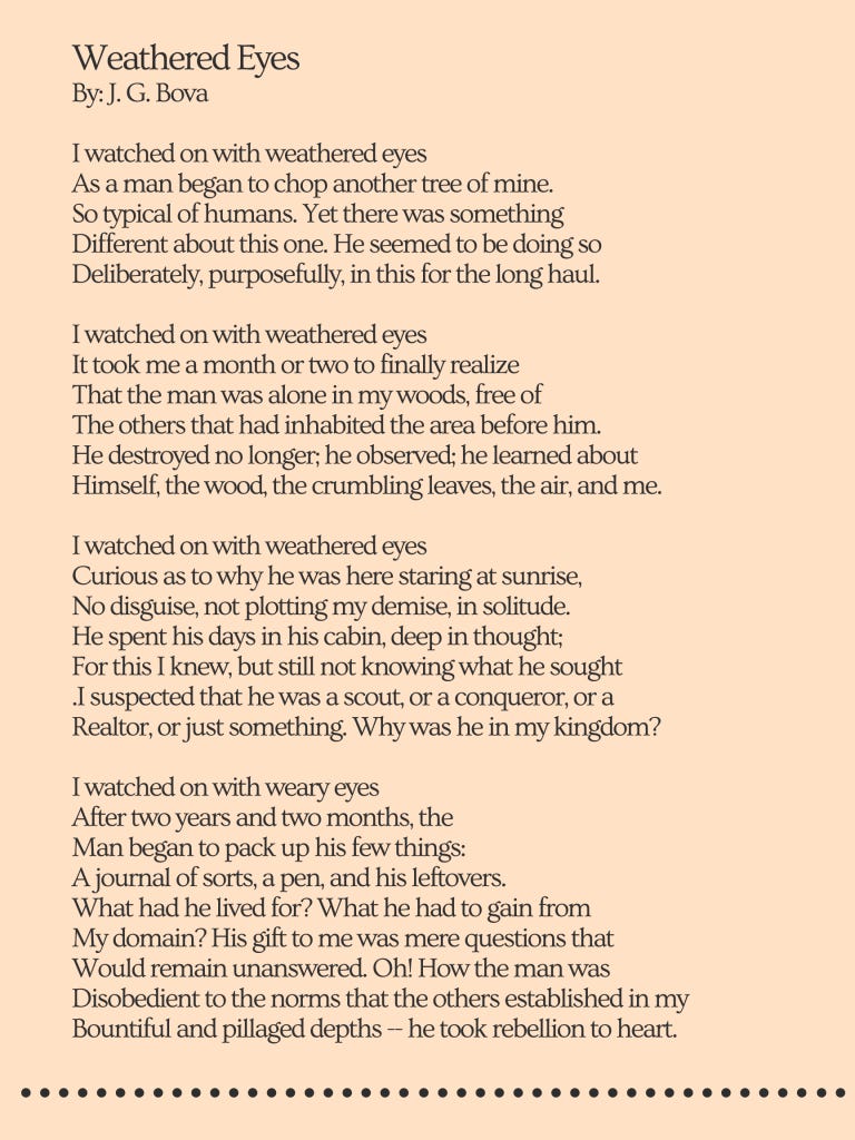 During these times of new normals and isolation, there has certainly been a lot to process. However, there is beauty within the little things we notice in solitude. We hope that you find comfort in the poems we have collected from three writers: J. G. Bova, Xiaoyu Liu, and Sofia Perez. Without further ado, the first volume of our new collection: Poetry in Isolation.