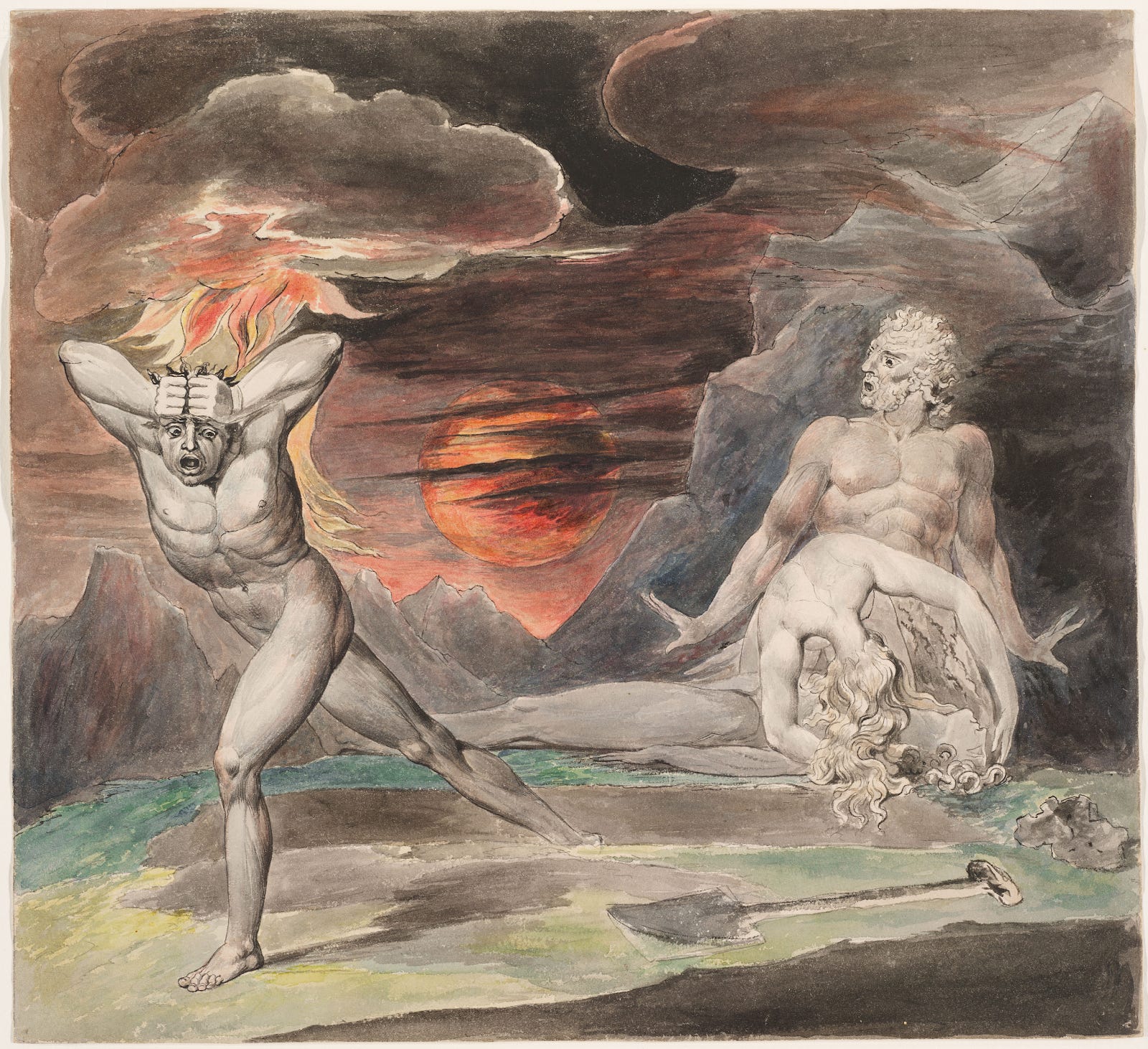 Yet, the more you look at it, that very uncanniness becomes captivating. Adam’s body disappears behind Eve’s grief-stricken torso, which bends down to embrace the corpse of Abel, whose extended leg then melts into the fleeing Cain; four figures united by this one act of violence. The scenery, too, exhibits a strange unity: the gray peaks dissolve into the clouds, whose fiery discharge bleeds into the ominous sunset. You begin to wonder where in the world Blake learned to paint like that. Certainly not at the Royal Academy. The more you study Blake’s painting, the more its artistic unity is revealed, the stranger it becomes, until you are forced to reckon with the untameable otherness of Blake’s radical artistic vision, the likes of which you have never seen before.