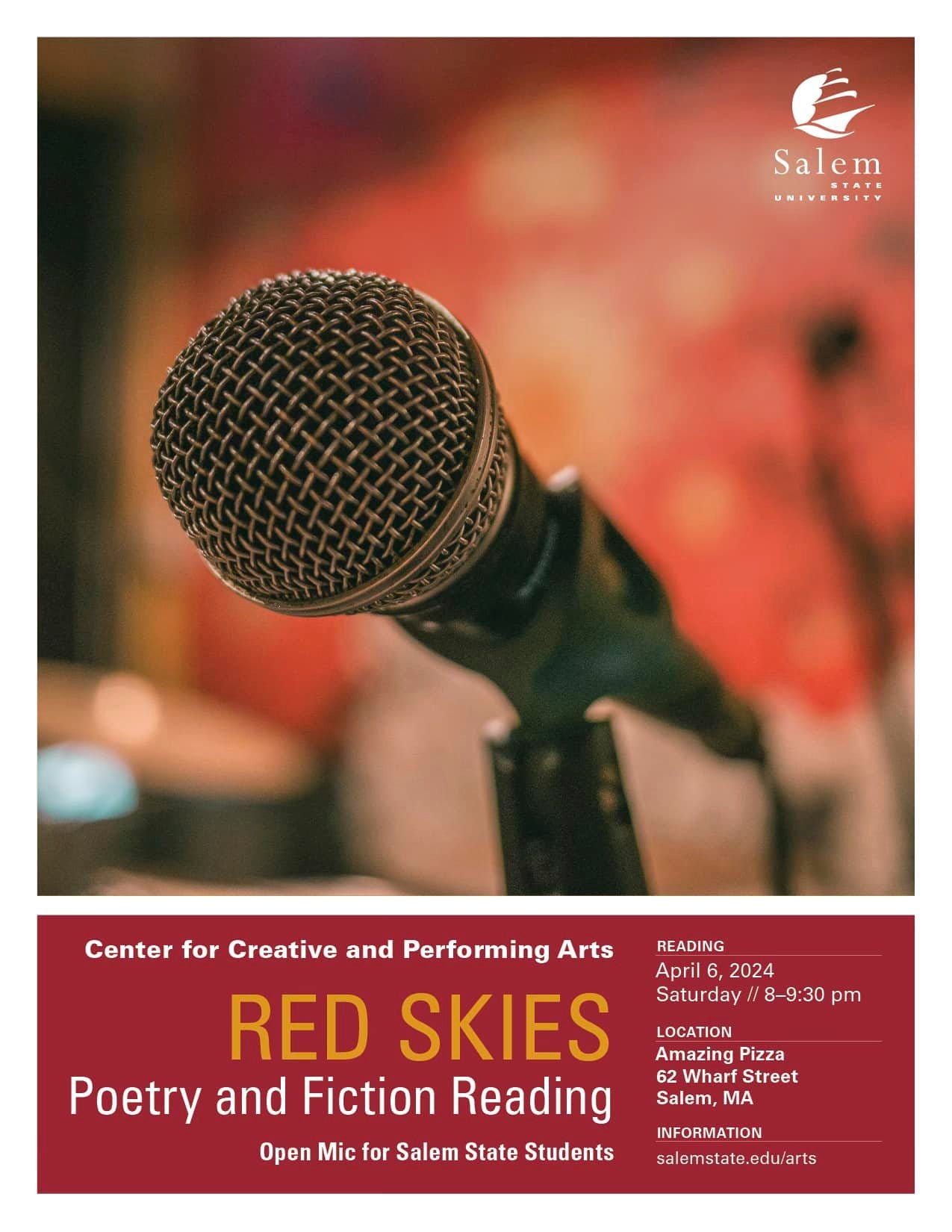 Red Skies First Ever Live Event!Red Skies Magazine EditorApr 04, 2024ShareCome hear poetry and fiction by Salem State students or read a piece of your own at our open mic night on April 6th at Amazing Pizza in SalemPreviousNext